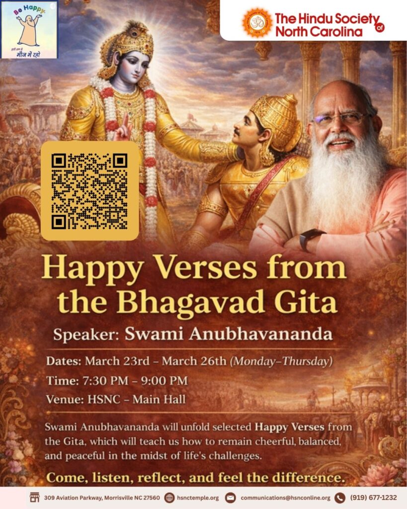 The Bhagavad Gita is a timeless guide to joyful living and inner freedom. In this inspiring discourse series, Swami Anubhavananda will unfold selected Happy Verses from the Gita, verses that teach us how to remain cheerful, balanced, and peaceful in the midst of life’s challenges.