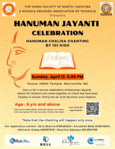 The Hindu Society of North Carolina (HSNC) in association with the Madhya Pradesh Association of Triangle invites you to a special Hanuman