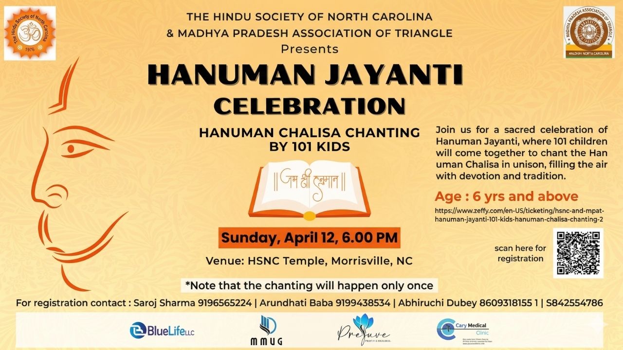 The Hindu Society of North Carolina (HSNC) in association with the Madhya Pradesh Association of Triangle invites you to a special Hanuman Jayanti Celebration.