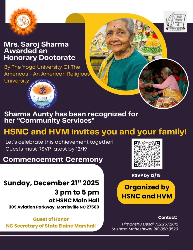 HSNC and HVM (Hindi Vikas Mandal) invite you and your family to celebrate Dr. Saroj Sharma’s remarkable achievement, her passion, and dedication to the community as she receives an Honorary Doctorate from The Yoga University of the Americas, an American Religious University.