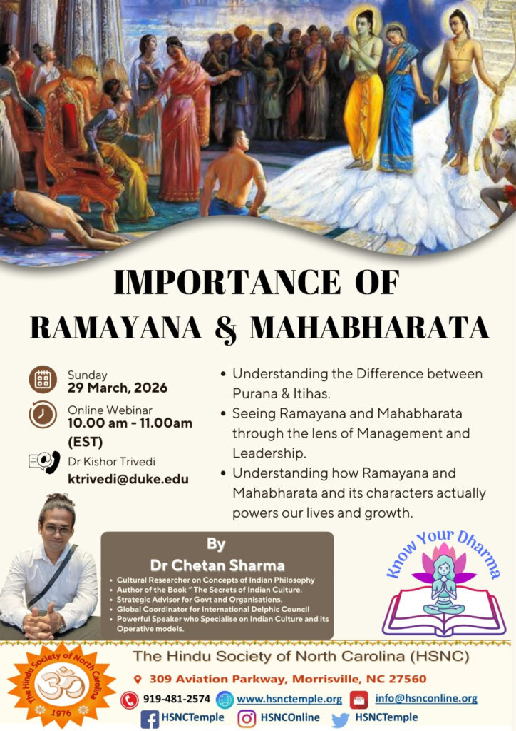 Join The Hindu Society of North Carolina (HSNC) for an enriching online webinar exploring the deeper meanings of Purana and Itihas, and how the timeless wisdom of the Ramayana and Mahabharata continues to guide leadership, management, and personal growth in today’s world.