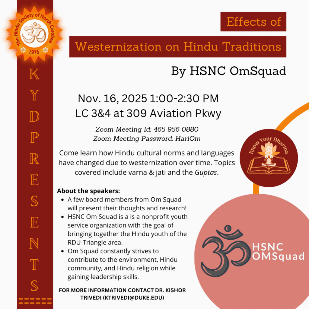 Hindu Society of North Carolina (HSNC) has embarked on a new initiative, “Know Your Dharma”. The aim is to introduce our second generation, our college students and young professionals to: