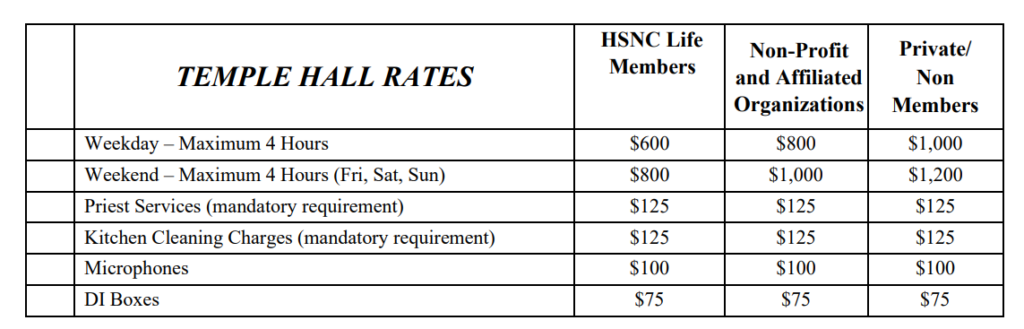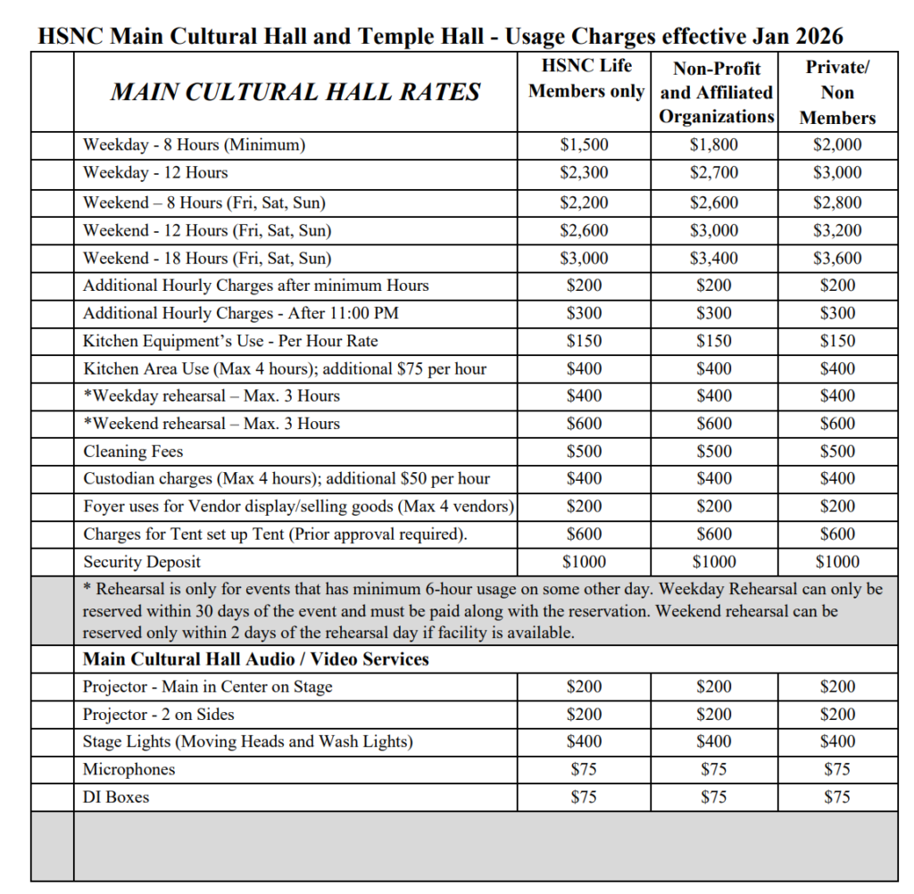 For Facility Reservation inquiries, please check the availability of the facility, review policies and rates published on this page, and then email rental@hsnconline.org. If need to talk to someone, please call in following order. Rental Coordinator: +1 (919) 491-3786 Shiva Raghunanan- +1 (919) 337-3752